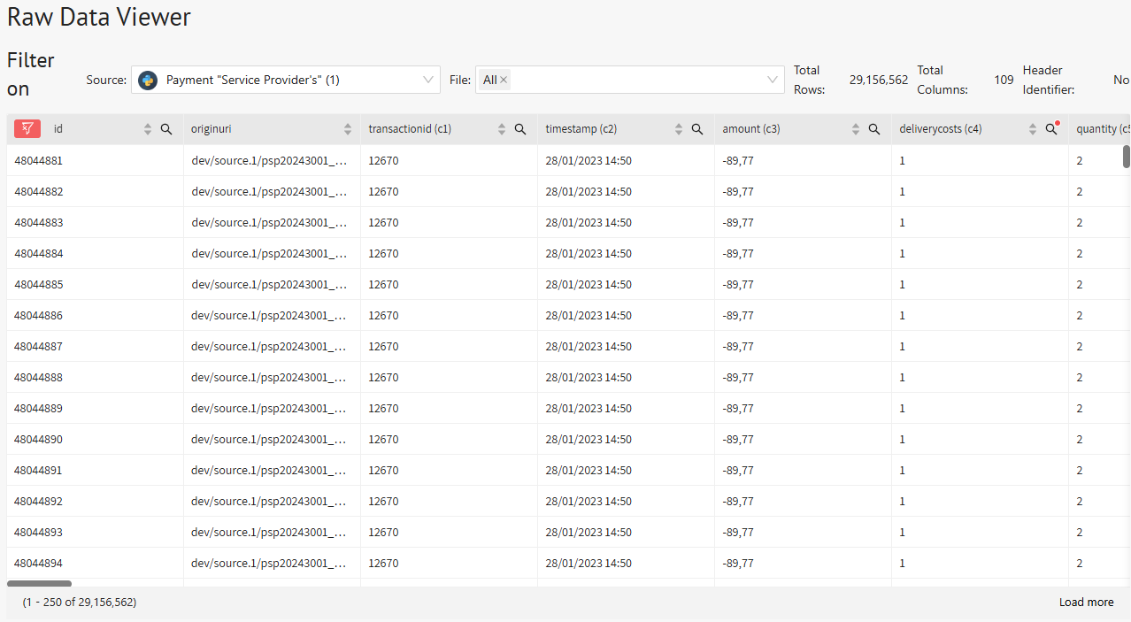 The page allow to filter by a specific source, a specific file and to filter in each of the columns. Allowing you to easily find specific lines (like order numbers, invoices or certain amounts) within millions of lines in the platform.
